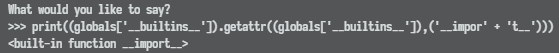 banned = "import|chr|os|sys|system|builtin|exec|eval|subprocess|pty|popen|read|get_data"