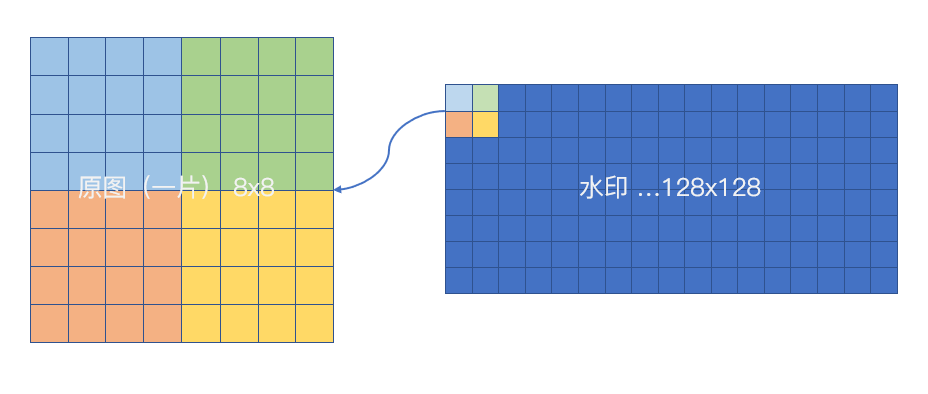 题目给出的图片边长为 512,按照论文需要分割为边长为 8 的方块。因此可以分割成 4096 个方块,而对应水印则必须编码四个点位,每一个水印像素点位花费 16 个原图像素。即所分割的一片编码四个水印像素点位。进而将水印编码进去。