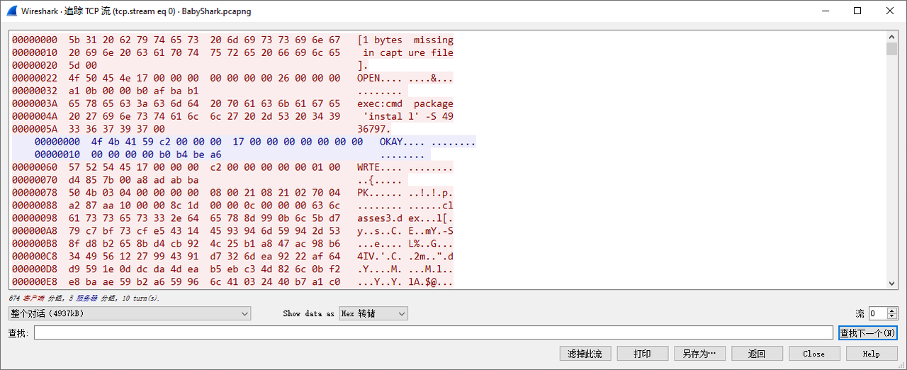 使用 WireShark 进行流量分析,在 TCP 流 0 处可以发现调试桥的流量。从中可以提取出一个 apk 文件。