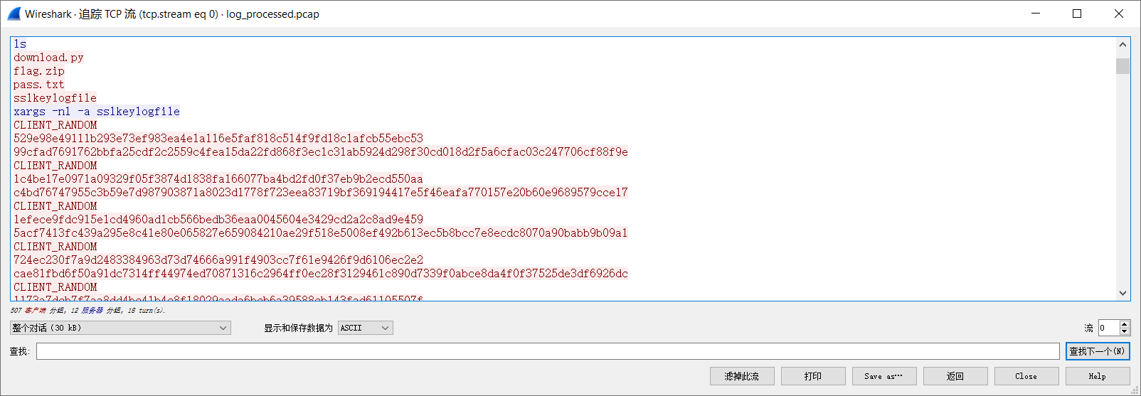 打开处理好的流量包,可以发现一些 Socks 和 TCP 流量,根据提示将 Socks 流量重新设置解码为 TLS。跟踪 TCP 流到 0 可以发现传输的 SSL Key Log file。