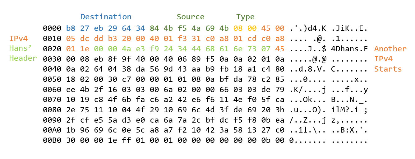 对排好序的流量包进行分析,可以发现大部分都是 ICMP 流量,还有一些是 IPv4 的数据。对其进行分析可以发现两个 IPv4 中夹杂着一段数据,搜寻之后可以找到一个用于使用 ICMP 进行通讯的工具 Hans。尝试将 Hans 插入的数据删除,恢复原本的结构。