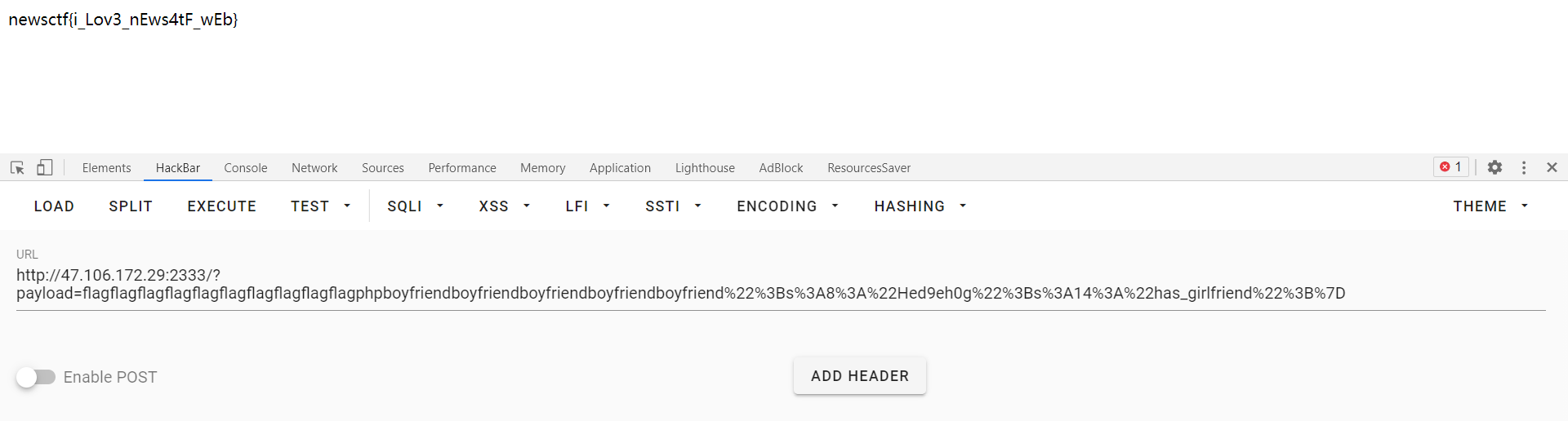 $payload = str_repeat("flag", 10) . str_repeat("php",1) . str_repeat("boyfriend",5) .'";s:8:"Hed9eh0g";s:14:"has_girlfriend";}' ;