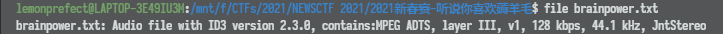 使用 tingshuonixihuanyangmao 对羊毛.jpg 执行 outguess 可以得到 brainpower 的压缩包密码 Wdn1His87。将压缩包解压后得到一个文本文档,file 一下可知是音频文件。