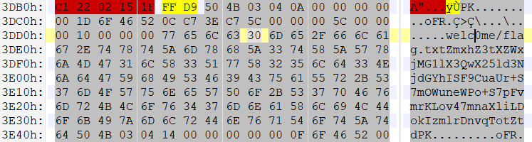 使用 010 editor 打开文件可在文件尾部发现压缩文档,同时因为其采用了仅存储的方式压缩,明文直接可见。