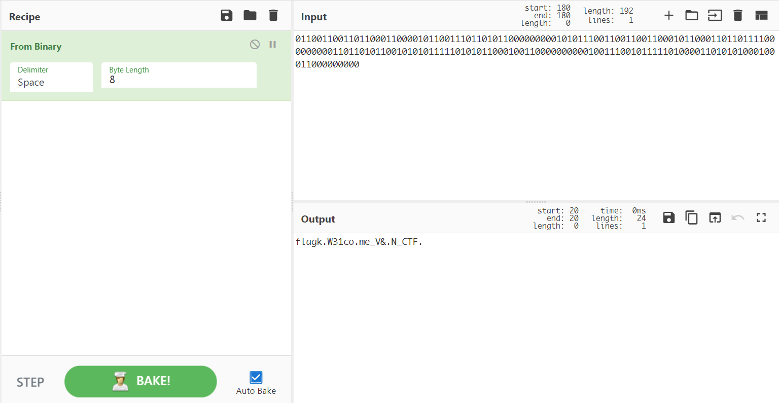 使用 CyberChef From Binary 解码可以大致看出 flag。