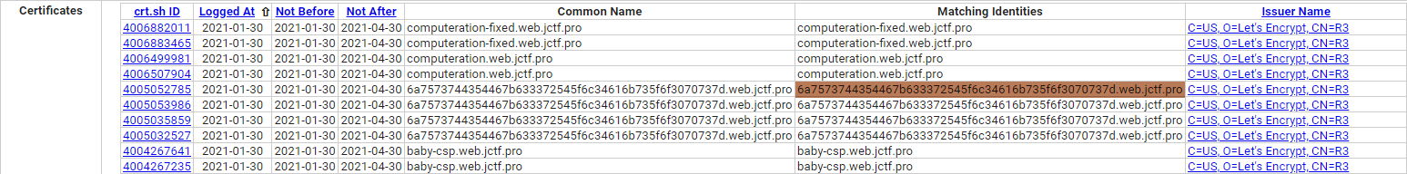 将所得到的域名的第一段,即 6a7573744354467b633372545f6c34616b735f6f3070737d,经过 From Hex 的解码之后可以得到 flag。