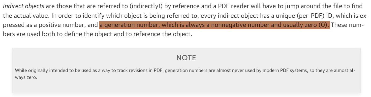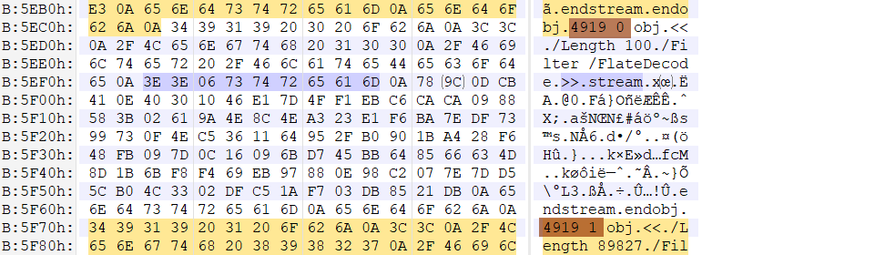 参照这篇文章可知 stream 必须要有一个 generation,查找流的时候可以发现有两个流使用了同一个 object ID,不同的 generation,而这个属性通常为 0。所以猜测 generation 为 1 的 stream 中藏有不同寻常的内容。