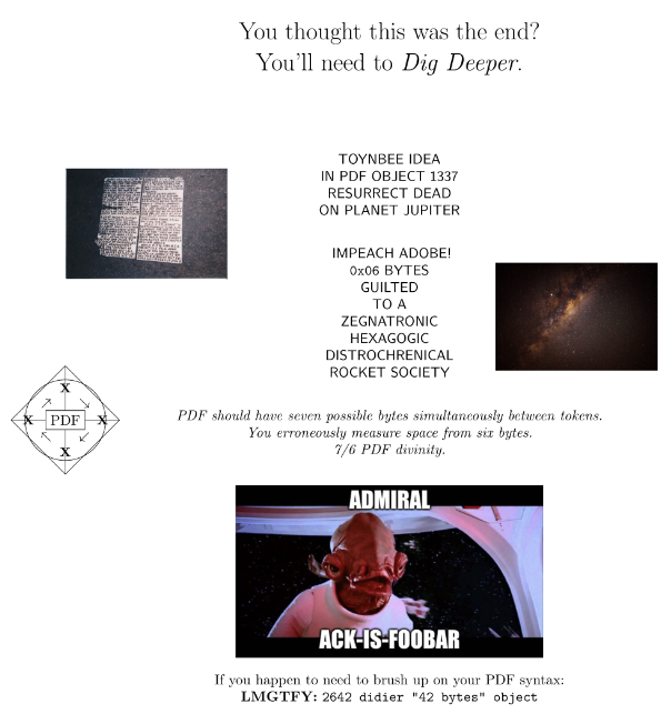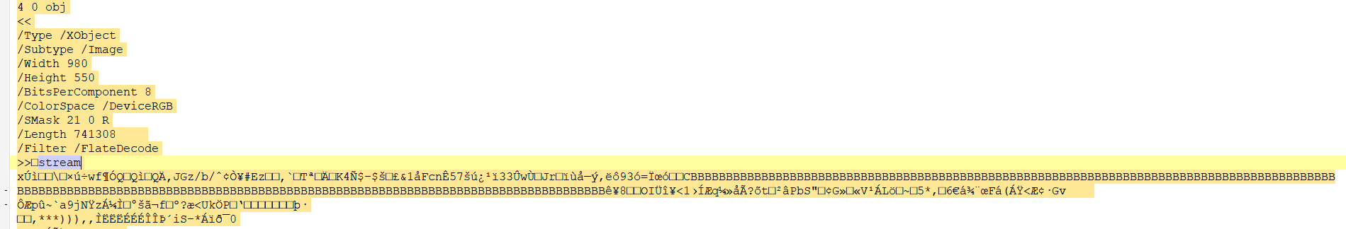 在搜索引擎上找 2642 didier "42 bytes" object,可以发现一篇文章,讲的是 PDF Stream。读完之后回到 PDF 文件上,找一下 PDF 文件的 Stream。从每一个流的头部可以找到流的类型,长度以及过滤器。如果是图片,还能看到更多信息。