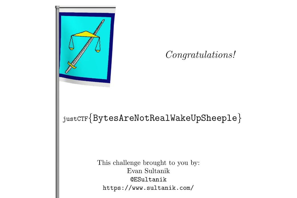 justCTF{BytesAreNotRealWakeUpSheeple}