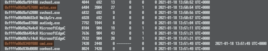 使用 cmdline 先读一下命令行的历史,发现没有值得深入的地方。于是将 mstsc.exe 这个进程的部分 dump 下来。