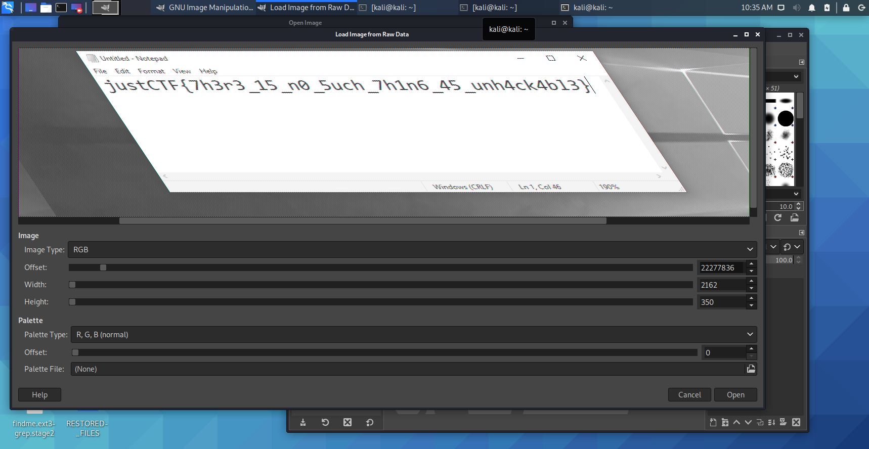 放到 Kali 下使用 GIMP 直接打开 raw data,调整宽高可以看到如下图片。