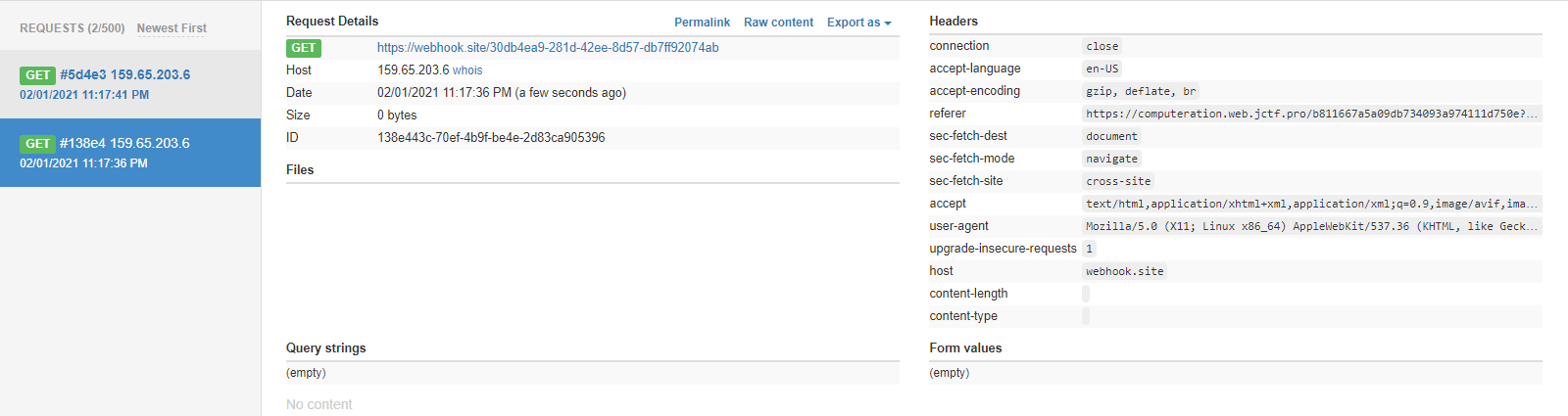 report 页面有一个提交网址的页面,提交之后会有 bot 去访问页面,因此想到监听请求。使用这个网站监听一下请求。